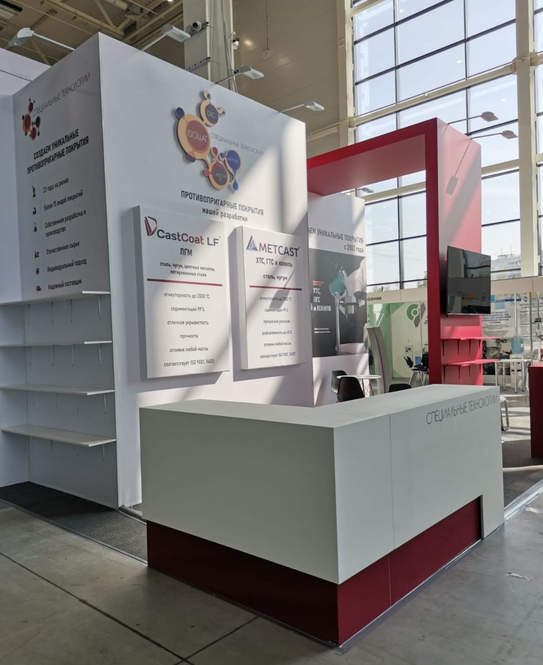 Максимально открытый стенд. Эта особенность предоставляет визуальный доступ к товару большинству посетителей выставки. Конструкторам рекламной площадки удается донести до потенциального заказчика услуги максимальный объем информации за минимальный промежуток времени.